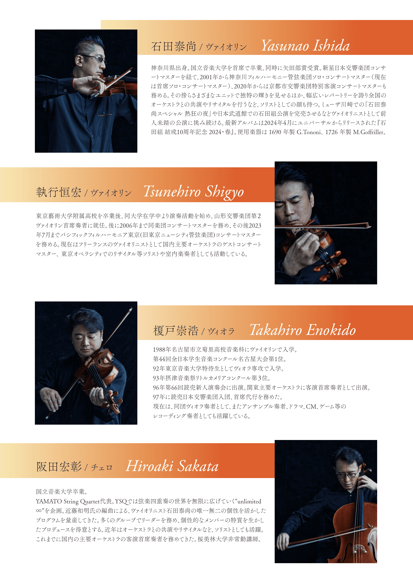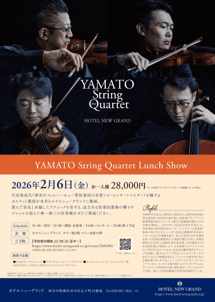 各地で完売を続出させる石田泰尚(神奈川フィルハーモニー管弦楽団首席ソロ・コンサートマスター)を擁する弦楽四重奏団「YAMATO String Quartet」によるランチショーを開催いたします。